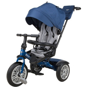 Переднее колесо управляется с помощью ручки, а вращение педалей можно отключить, и при движении они не будут задевать ножки ребенка. Подножки с антискользящими вставками. Есть дополнительная подножка, корзина для игрушек с крышкой. На ручке управления сумочка с ремнем и магнитным замком. Ручка регулируется по высоте. Крыша с окошком, как у детской коляски, снимается и складывается. Велосипед оснащен стояночным тормозом.