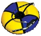 Санки - ватрушки Пик 99 Скат - Е надувные санки - “ватрушки” представляют собой оболочку из ткани, снабженную буксировочным ремнем и ручками из прочной стропы, в которую вставлена автомобильная камера. Нижняя часть оболочки ватрушек выполнена из прочной ткани с ПВХ- покрытием (типа "Совтрансавто", в народе - ТЕЗА), которая устойчива к истиранию и обеспечивает санкам отличное скольжение по снегу. Верхняя часть оболочки изготовлена также из тезы, либо из прочной синтетической ткани (модели с индексом “Е”). Первый вариант более долговечный, но зато и существенно более дорогой.